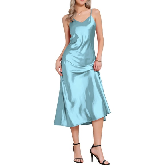 CURVOSPORT Vestido de Satén para Mujeres de Pascua con Tirantes Espagueti y Escote en V, Elegante Vestido Maxi Deslizante M Azul ClaroCURVOSPORT Vestido de Satén para Mujer con Tirantes Espagueti y Escote en V, Elegante Vestido Maxi Deslizante XS Azul Pavo Real