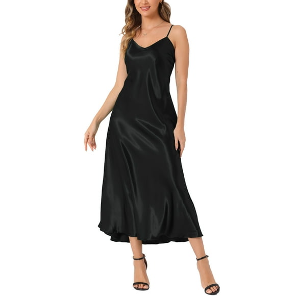 CURVOSPORT Vestido de Satén para Mujer con Tirantes Espagueti, Escote en V, Elegante, Maxi, Deslizante, Color Negro