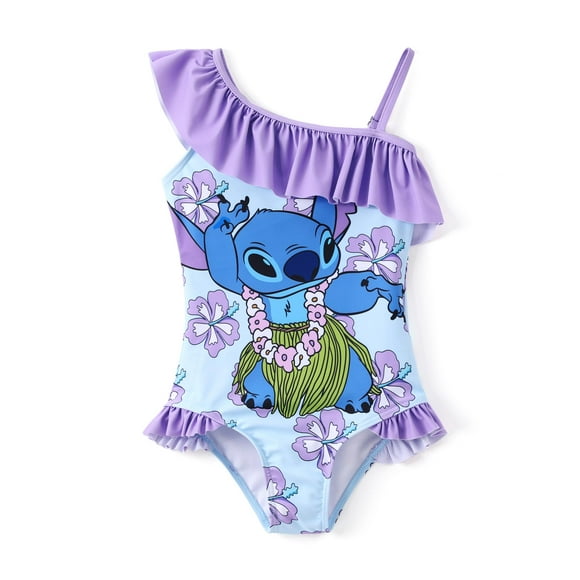 Traje de baño Disney Stitch para niñas de una sola pieza, color morado, tallas 12-13YTraje de baño Disney Frozen Elsa con un hombro y volantes para niñas de 4 a 5 años