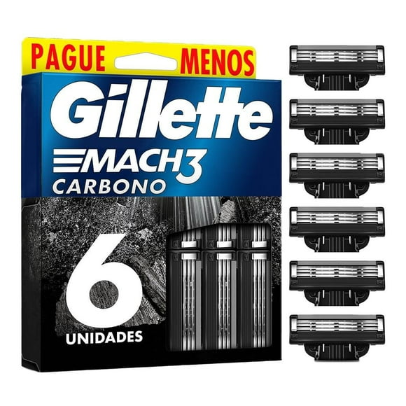 Cartucho de rastrillo Gillette Mach3 carbono con carbón activado y 3 hojas, 6 pzasCartucho de rastrillo Gillette con 5 hojas para rasurar la barba 2 pzas