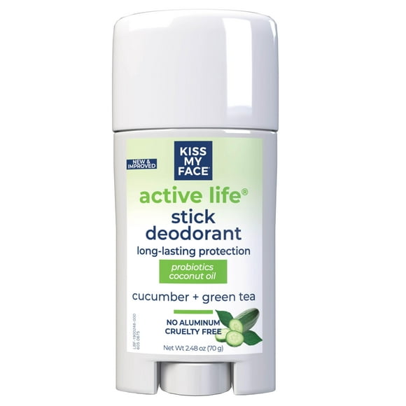Desodorante Kiss My Face Active Life con ingredientes naturales, 72 horas de control del olor | Para mujeres y hombres, sin aluminio, con aceite de coco y probióticos, aroma a pepino y té verde.