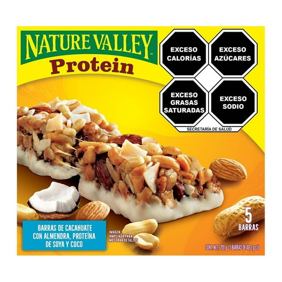 Barras Nature Valley Protein de cacahuate con almendra, proteína de soya y coco 201 gBarras de granola Nature Valley sweet and salty chocolate 5 pzs