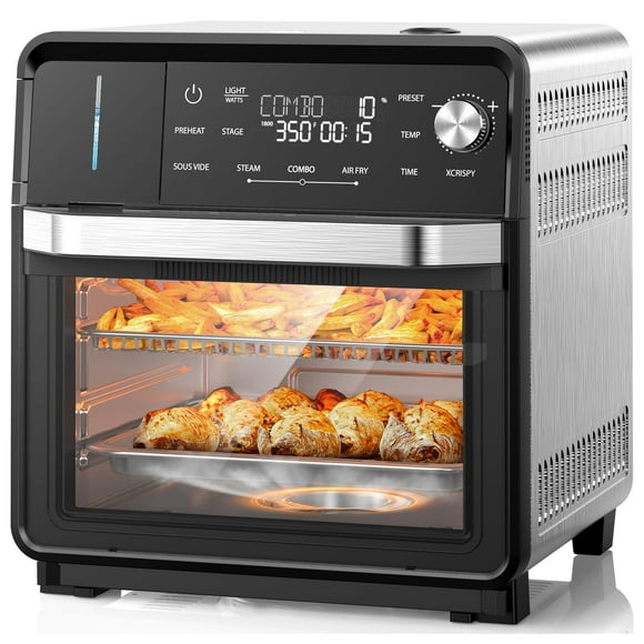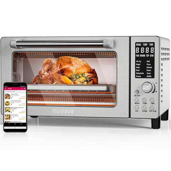 Nuwave Bravo Air Fryer Toaster Smart Oven, 12-in-1 Countertop Convection, 1800 Watts, 21-Qt Capacity, 50°-450°F Temp Controls, Top and Bottom Heater Adjustments 0%-100%, PFAS Free, Stainless SteelHorno de vapor Nuwave Combi 16Qt, todo en uno, de acero inoxidable