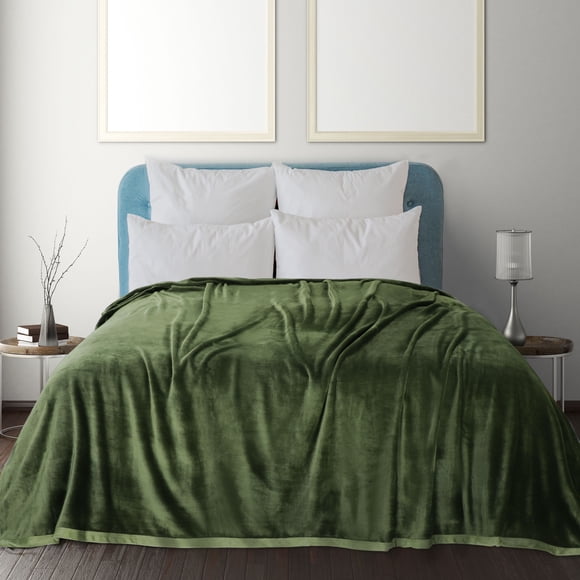 Manta de franela PiccoCasa suave y cálida con dobladillo ancho en verde oliva tamaño completo