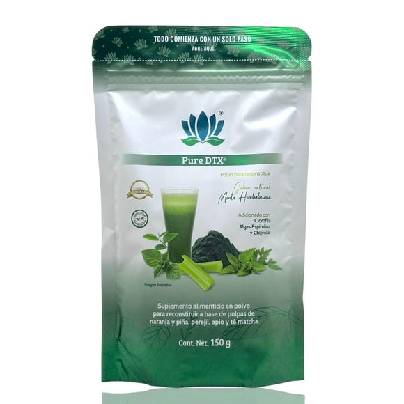Clorofila en Polvo DTX Pure Health Espirulina Menta Hierbabuena 150 gProteína de Soya y Chícharo Café c/Crema 500 g Pure SHK Pure Health