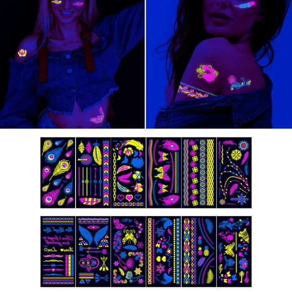 12 tatuajes que brillan en la oscuridad, reaccionan a la , decoraciones para fiestas, pintura corporal para fiestas de cumpleaños. Estilo A