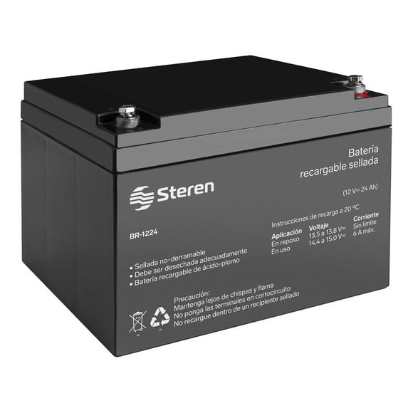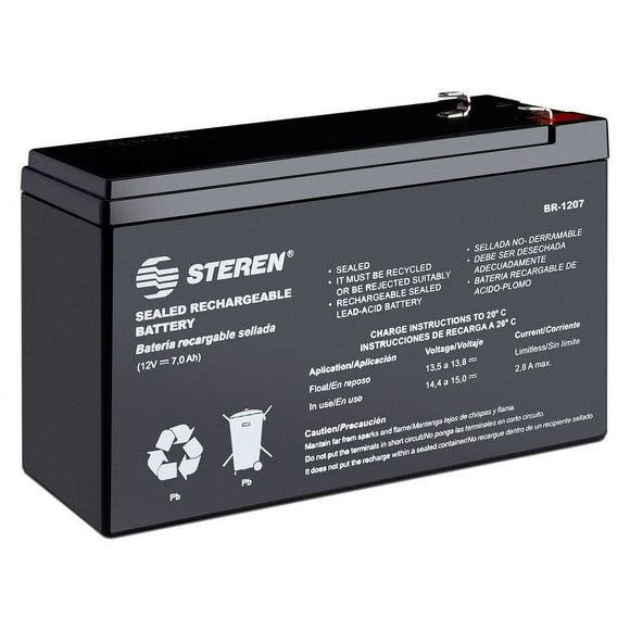 Batería sellada de ácido-plomo, 12 Vcc 24 Ah Steren BR-1224Batería Recargable BR-1207 Steren Sellada de Ácido-Plomo 12V 7Ah