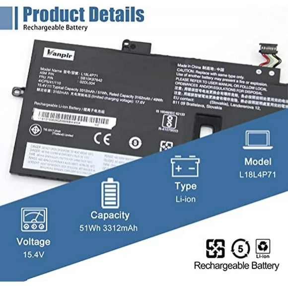Vanpir L18L4P71 Reemplazo de Batería para Laptop Lenovo ThinkPad X1 Yoga 4ª Gén/X1 Carbono 7ª Serie 8ª Gen 02DL004 SB10K97642 02DL005 L18M4P72 SB10K97643 02DL006 L18C4P71 SB10K97644 15.4V 51WhBatería para Laptop VANPIR 01AV431 11.52V 57Wh para Lenovo X1