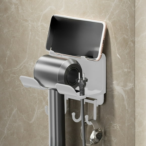 Soporte de Secador de Pelo Sin Taladro para Pared, Organizador Multifuncional de Plástico con Gancho y Porta Teléfono, Almacenamiento de Baño que Ahorra Espacio, Blanco/Gris/Negro, 16x10x9cmEstante de almacenamiento para secador de pelo montado en la pared | Organizador de baño de plástico ABS con ganchos | Montaje adhesivo sin perforación | Estante compartimentado para secador de
