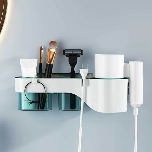 Estante de almacenamiento plástico para secador de pelo montado en pared con tres compartimentos y cuatro ganchos, organizador de baño sin taladro, negro o azul, 27.5x10x9.5cm