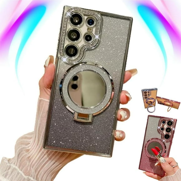 Transmitg para Samsung Glitter Rhinestones Funda magnética con soporte invisible y espejo cosmético, galvanizado 4 esquinas Airbag Anti-caída Degradado Cubierta Protector de lente de cámara (Plata, paLurvia Funda para teléfono, colorida pintura al óleo retro, diseño de flor y luna, funda protectora de TPU delgada a prueba de golpes, funda floral impermeable con airbag anti caída (verde, para iPhon