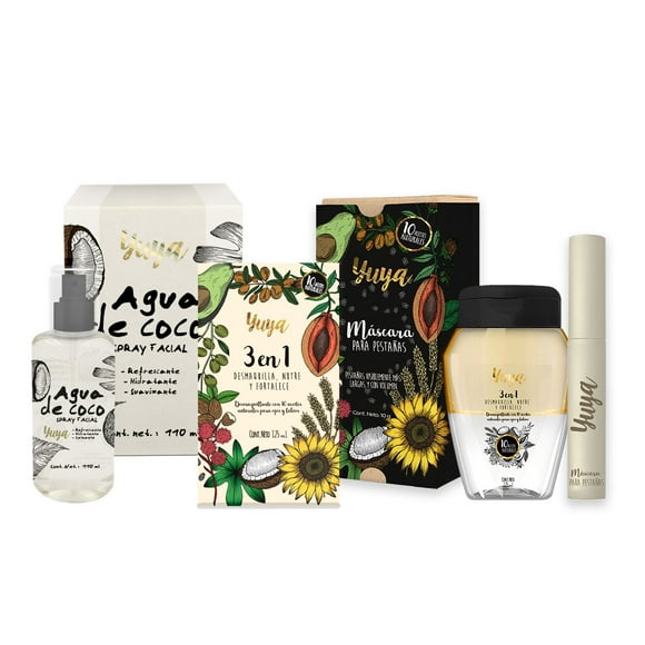 Yuya - Agua de Coco hidratante enriquecido con aloe vera y ginseng, 110 ml + Máscara 10 aceites naturales + DesmaquillantePack Yuya Primer Facial + Spray Fijador + Máscara 10 aceites + Gel de cejas