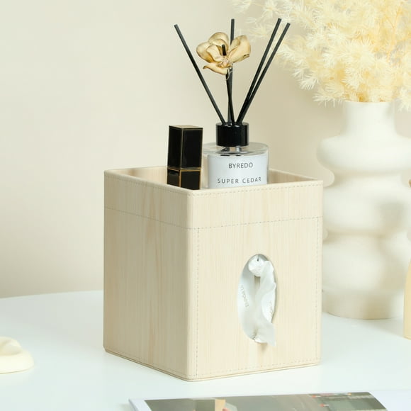 Zhuge Funda para caja de pañuelos, de piel sintética, cuadrada, con bandeja para baño, dormitorio, oficina, escritorio, color madera clara.Zhuge Funda cuadrada de cuero para caja de pañuelos - Elegante soporte cúbico para caja de pañuelos, caja decorativa de PU para mesita de noche, cuadrícula blanca y beige