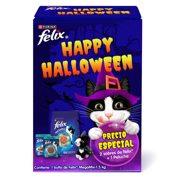 Kit para gato con alimento seco Purina Felix Happy Halloween Megamix, alimento húmedo felix y un peluche