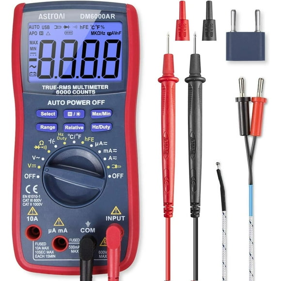 AstroAI Multímetro y Analizador Digital TRMS 6000 con Rango Automático, Mide Voltaje, Corriente, Resistencia, Diodos, Continuidad, Ciclo de Trabajo, Capacitancia, Temperatura