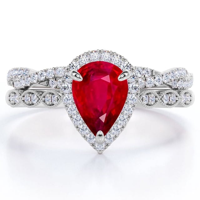 JeenMata Anillo de Compromiso Vintage con Rubí y Moissanita con Piedra Natal de Julio en Talla Pera de 1,5 Quilates: Conjunto Nupcial con Halo Pavé en Oro Blanco de 18 K sobre Plata