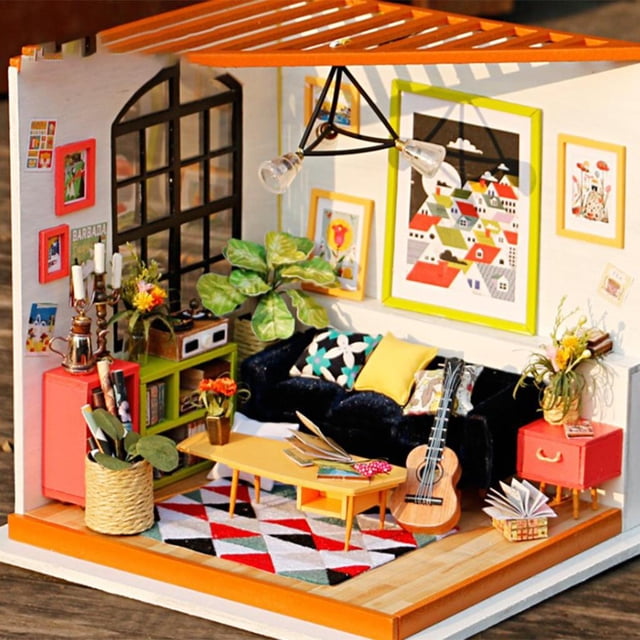 Casa de muñecas en miniatura con muebles, bricolaje, kits de madera, Sala de estar perfke Casa de muñecas de bricolaje