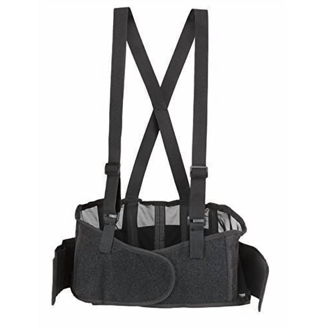 Soporte lumbar con tirantes ajustables, cierre de velcro, panel posterior transpirable de elastano y correas extraíbles.