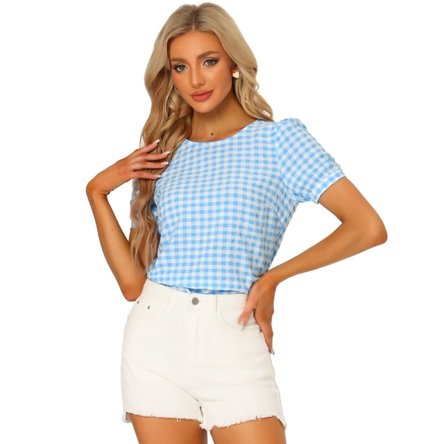 Blusa De Manga Corta Abullonada Vintage Con Cuello Redondo Y Guinga Informal De Verano Para Mujer Azul Claro S