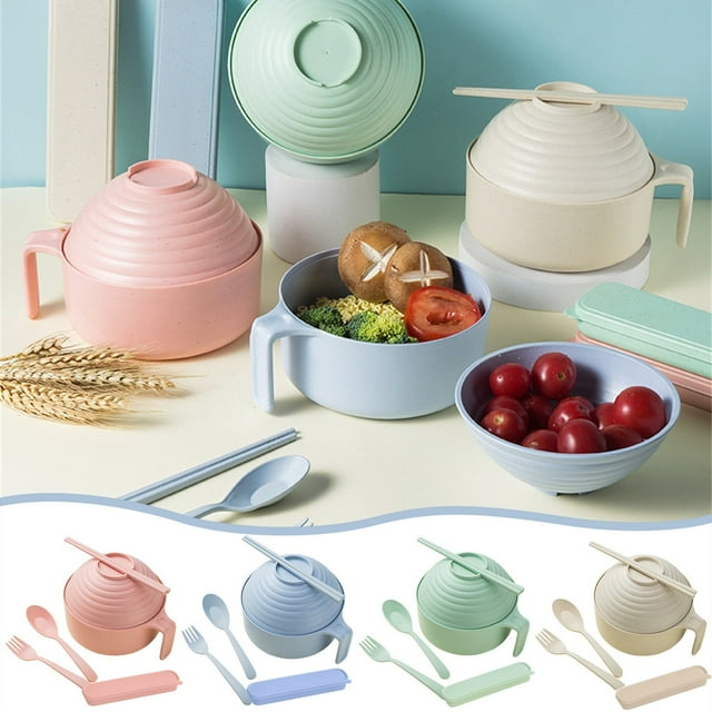 Juego de tazones para fideos ramen con tapa para microondas | Cuencos de drenaje multicapa, palillos, cuchara, tenedor y cubertero | Vajilla duradera de fibra de paja | Tazón grande de 950 g, tazón