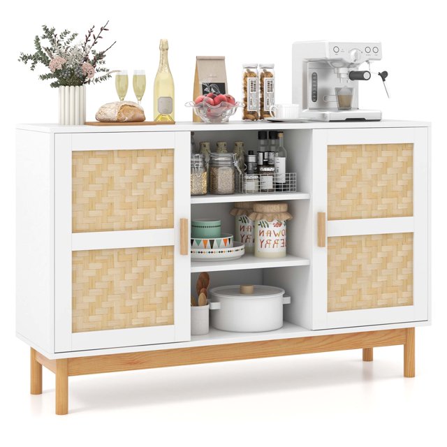 Costway Aparador Buffet, Mueble de Almacenamiento con 3 Estantes Abiertos y 2 Gabinetes Laterales, Mueble para TV de 120 cm con 2 Puertas Tejidas de Bambú, para Comedor, Sala de Estar, Natural