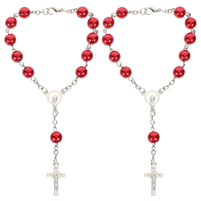 Rosario de coche para espejo retrovisor, colgante de cruz, decoración para coche, accesorio colgante para mujer y hombre, 2 piezas de cuentas de rosario católico rojo de metal