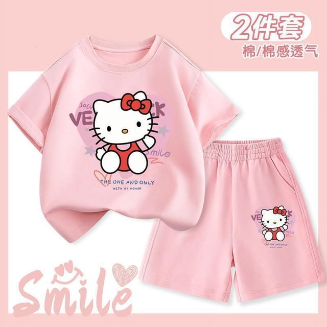 2Pcs Hello Kitty Children T-Shirt Set New Anime Sanrios Kawaii Cartoon Fashion White Short Sleeve Shorts Summer Beach Sportswear