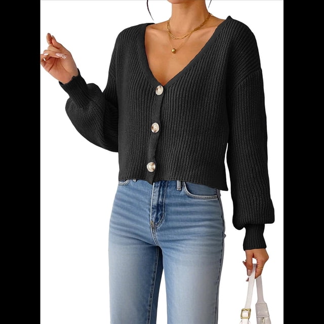 Suéter Tipo Cárdigan Corto de Punto Acanalado con Cuello en V y Larga para Mujer Negro M