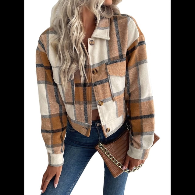 Chaqueta Corta de con Botones para Mujer, Estilo Informal A Cuadros, de Larga Caqui S