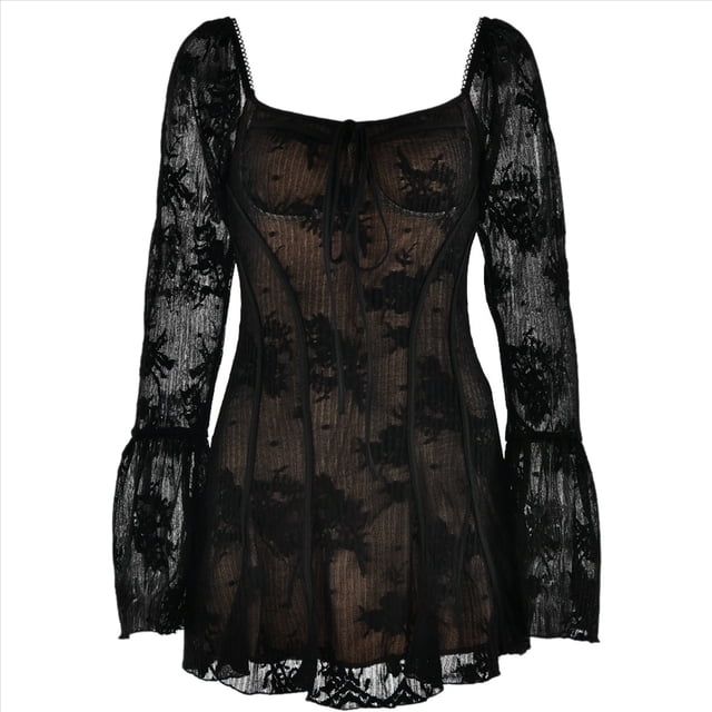 Vestido Mini de Mujer 2025 con Escote Cuadrado y Larga, Corte A, Corto. Negro S