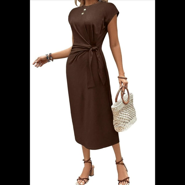 Vestido de Verano para Mujer, con Cuello Redondo, Informal, Elegante, con Lazo en la Cintura y Corta. Café S