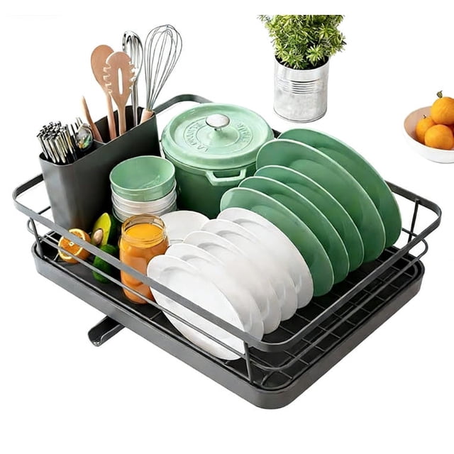 Escurridor de Platos Compacto de Acero Inoxidable con Porta Cubiertos Desmontable para Encimera de Cocina en Color Gris