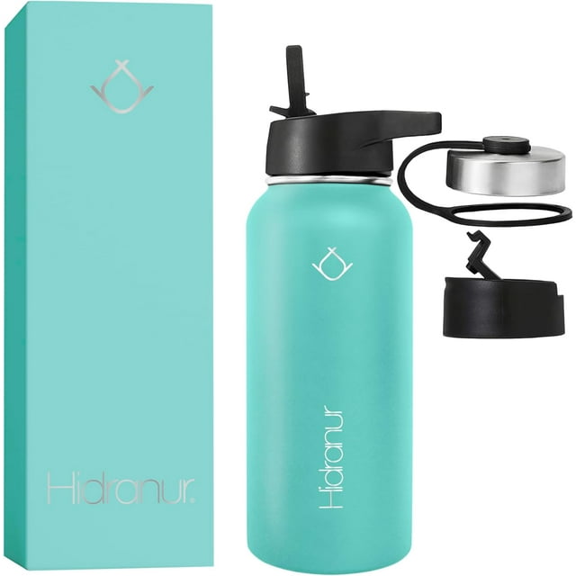 Termo Hidranur de Acero Inoxidable 32 oz (946.35 ml), con 3 Tapas Herméticas y 2 Popotes, Turquesa