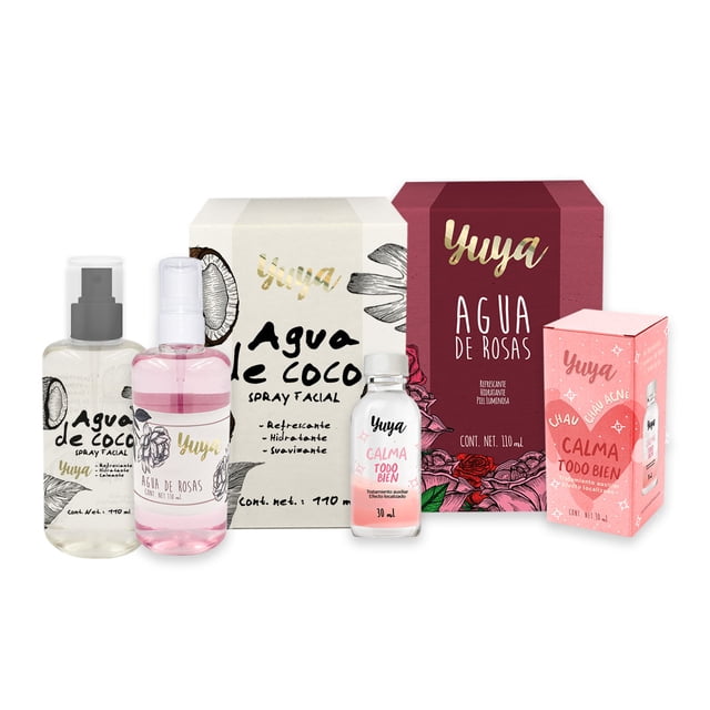 Yuya - Agua de Coco hidratante enriquecido con aloe vera y ginseng, 110 ml + Agua de rosas piel luminosa, 110 ml+Calma todo bien