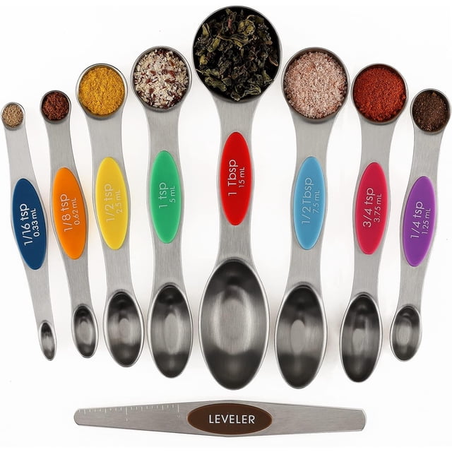 Cucharas medidoras magnéticas, juego de 9 cucharadas apilables de acero inoxidable de doble cara para medir ingredientes secos y líquidos