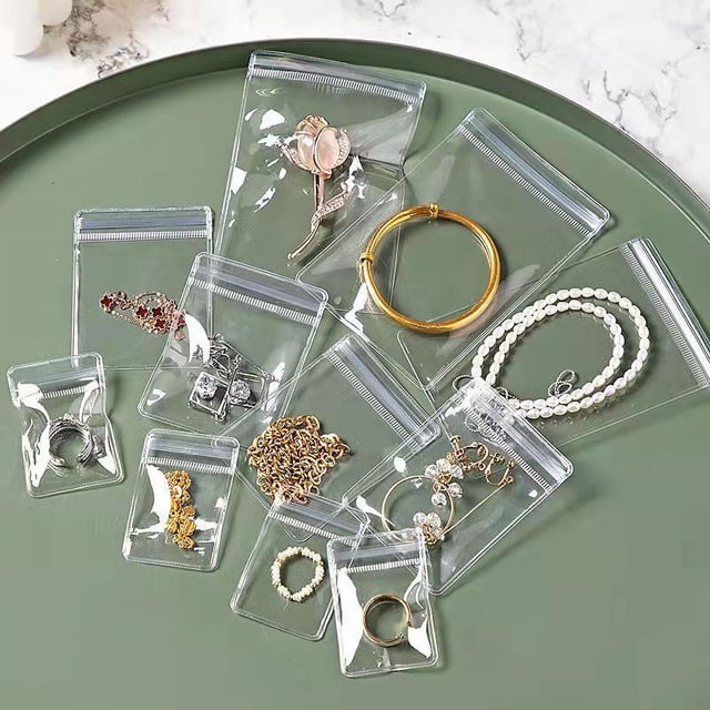 Bolsa sellada de PVC transparente para joyas, bolsa para guardar pendientes, joyas, texto de joyería, cuerda para jugar a la mano, bolsa autosellada, bolsa de embalaje, 100 unidades