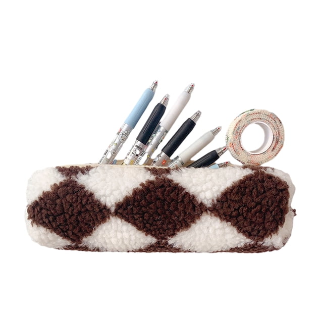Estuche para lápices de felpa FloreceBien, bolsa de papelería para estudiantes, bolsa de almacenamiento de gran capacidad, estuche para lápices portátil con entramado de diamantes, marrón