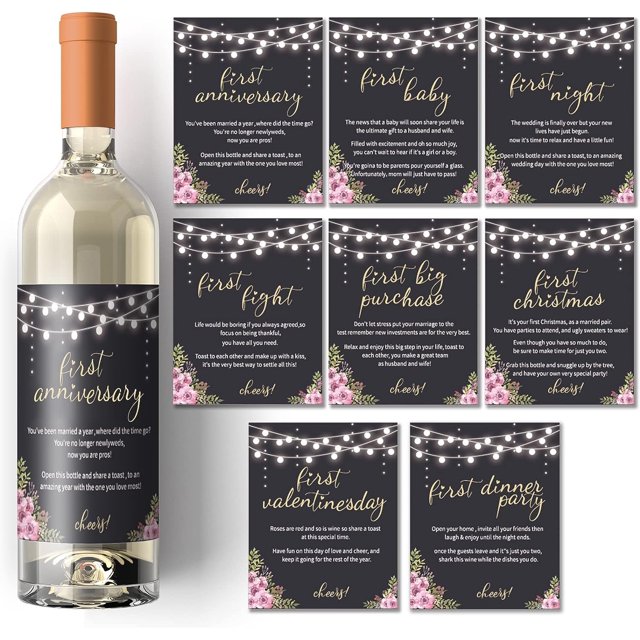 16 hojas de 8 estilos de pegatinas para etiquetas de botellas de vino con temática de boda, pegatinas decorativas para botellas, papel recubierto para decoración de bodas, aniversarios, fiestas,