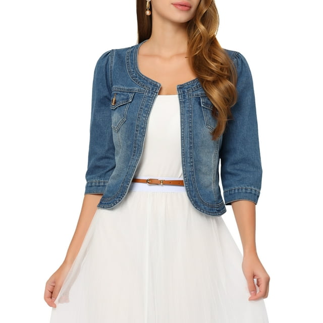 Allegra K Chaqueta de mezclilla sin cuello para mujer Chaquetas de mezclilla de manga 3/4 Azul XS