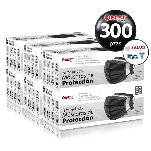 Best Trading Cubrebocas Negro 300 piezas, Mascarilla Desechable Termosellada Tricapa, Tapabocas con 300 Piezas con Ajustador Nasal Oculto y Tecnología Ligera de Filtrado Efectivo