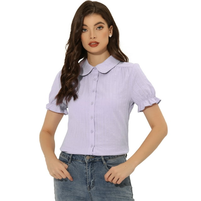 Blusa de algodón con volantes y cuello vuelto Allegra K Morado Claro XS