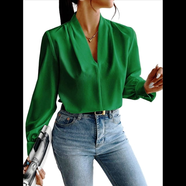 Blusas de Trabajo para Mujer, Blusas de Larga, Blusas de Oficina con Cuello en V, Blusas de para Mujer Verde M