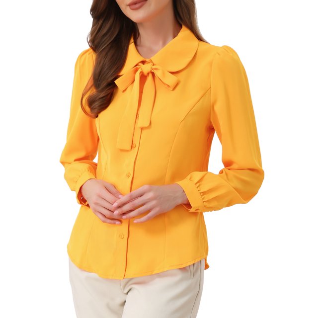 CAMISA DE MUJER CON BOTONES INSPIRE CHIC, CUELLO PETER PAN, CON LAZO, BLUSA DE COLOR SÓLIDO L, AMARILLO BRILLANTE