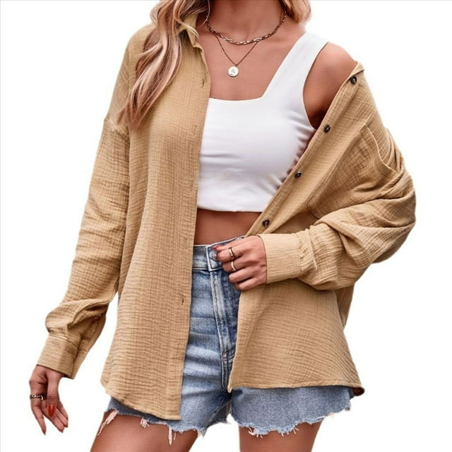 Camisas de Algodón para Mujer, de Larga, Estilo Boyfriend, con Cuello y Bolsillos. Albaricoque L