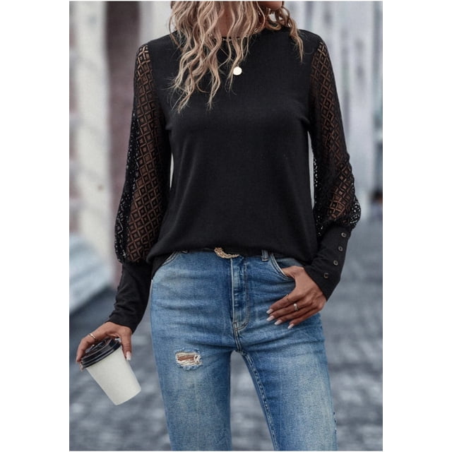 Camiseta de mujer de manga larga con mangas de encaje, tops, blusas, camisas de manga larga