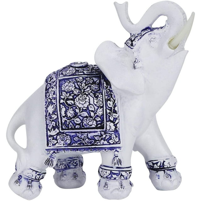 Estatuas de elefante Feng Shui, figuras de elefante blanco con trompa elevada para decoración del hogar (M-porcelana azul y blanca) ER